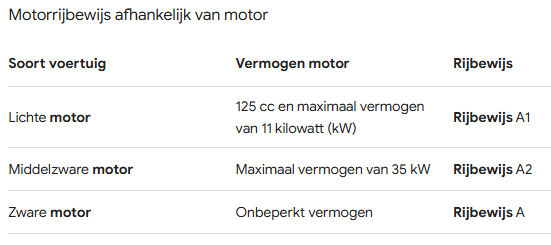 Het type rijbewijs dat je kunt halen, is afhankelijk van je leeftijd én van je ervaring. En het hangt af van het vermogen van de motor waar je op rijdt. Er worden drie categorieën onderscheiden: A1, A2 en A.