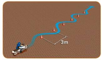 De bestuurder rijdt in een slalom (bochten links,- en rechtsom) tussen alle pylonnen door. De examinator let voornamelijk op het in balans houden van de motor in combinatie met een juiste bediening.